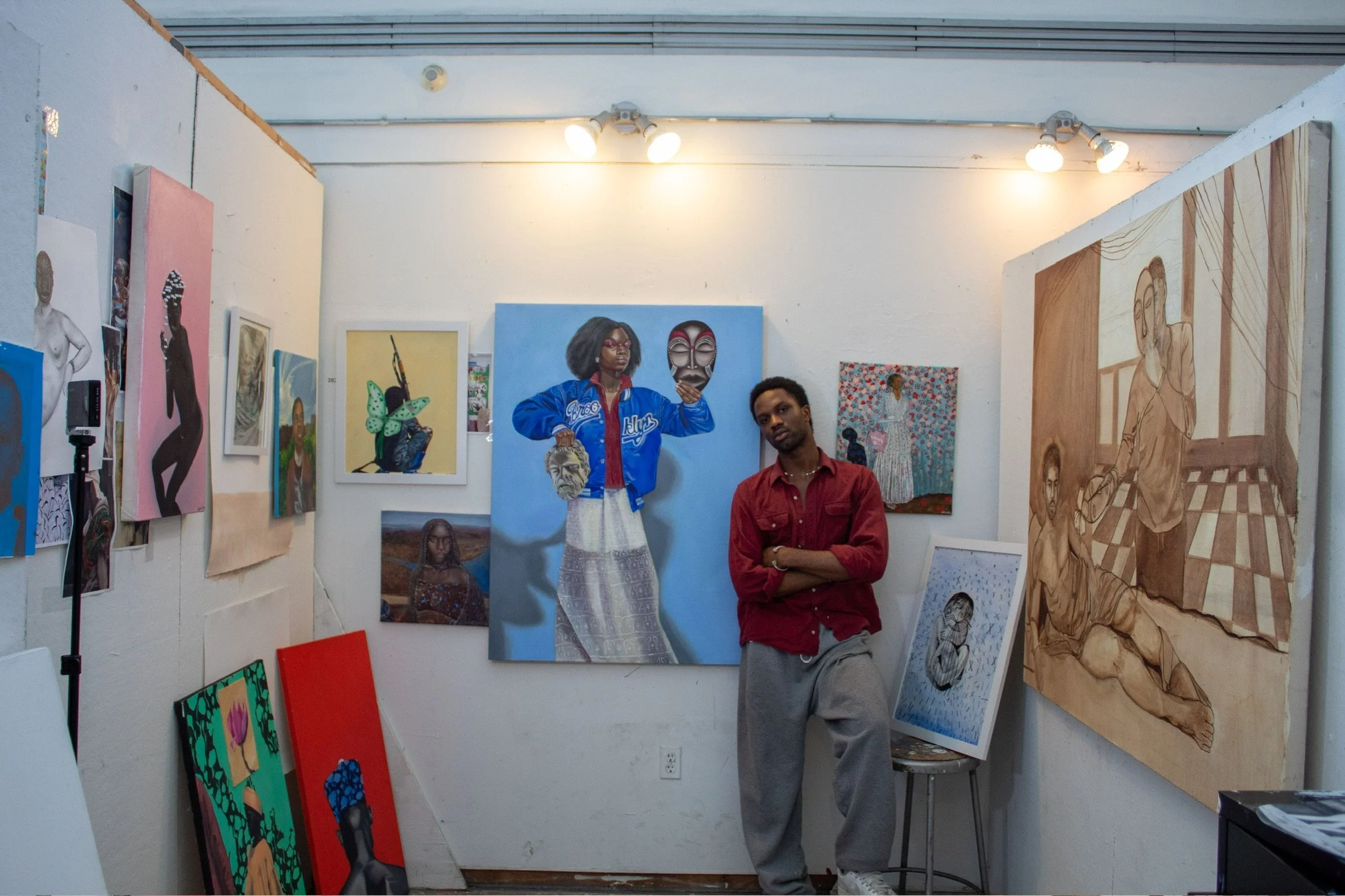 Fidelis Ayuwa Amed Izekor JR (b.2001 in Ologbo, Nigeria; lives and works in New York, NY) is a multimedia artist best recognized for his oil paintings and drawings, which explore the profoundness of identity through portraiture to further examine different ways of visual storytelling. Interested in civics and afro-futuristic fashion aesthetics, Fidelis Izekor merges the techniques of old western oil painting/drawing with ancient and contemporary African artmaking to cultivate a new form of image creation. This way of developing imagery derives from looking closely at how oil paint is built up to mimic realistic imagery while paying attention to the abstract nature of marks and shapes through the understanding of West African forms of abstraction, especially in textiles. By blending the homogeneity of patterning with high-level details of realism, Fidelis Izekor creates compositions that question and re-interpret what a portrait could look like. His work references pop culture and art history, as well as his own life - being born in Nigeria and moving as a child to the South Bronx, where he was raised. His experience in both places is a recurrent theme in his work and, for Fidelis, the construction of his figures is a means of representing a person's individuality and personal nature in an honest and raw way, even when those ways are rooted in fantasy and imagination. Though the representation of the self has been a prime focus for his practice, he has also explored depictions of landscape, poetry, nature and architecture.