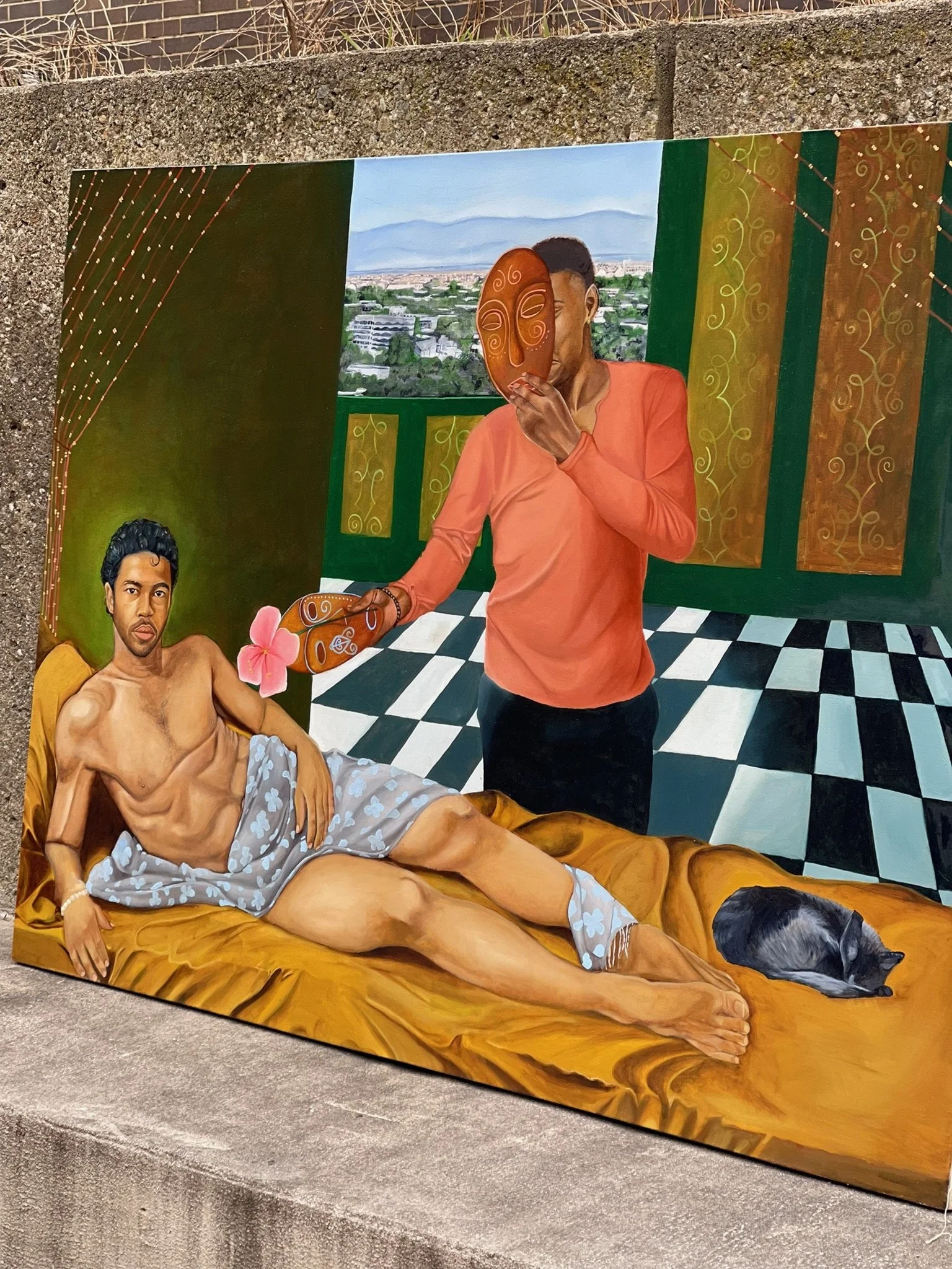 Storytelling is one of the most important forms of connecting and understanding the world around us. In telling stories of Black and Brown bodies, themes of identity, nationality, trauma, beauty, and society emerge. I paint compositions that symbolize life experiences but exist in fantasy. For instance, In my piece titled Venus of Hispaniola, there lies a young man on bed with a floral embellished cloth draped over his body exposing some parts of him. Hovering over him is another young man who hands him a flower and a mask as he too holds another mask up to his face. They both exist in a living space with green walls and checked tiles; outside the window of this space lies Hispaniola the birthplace of the two men. Although they are from opposite ends of the island that exist as two separate worlds, they find themselves together in the space of love. In creating this piece, I wanted to tell a story; one of romance and the historical relationship between Haiti and the Dominican Republic. While creating these compositions; it is important for me to not only understand the technical efforts that made them so dynamic but to understand the nuance of these pieces that have systematic impacts in the way we dissect the world around us.
