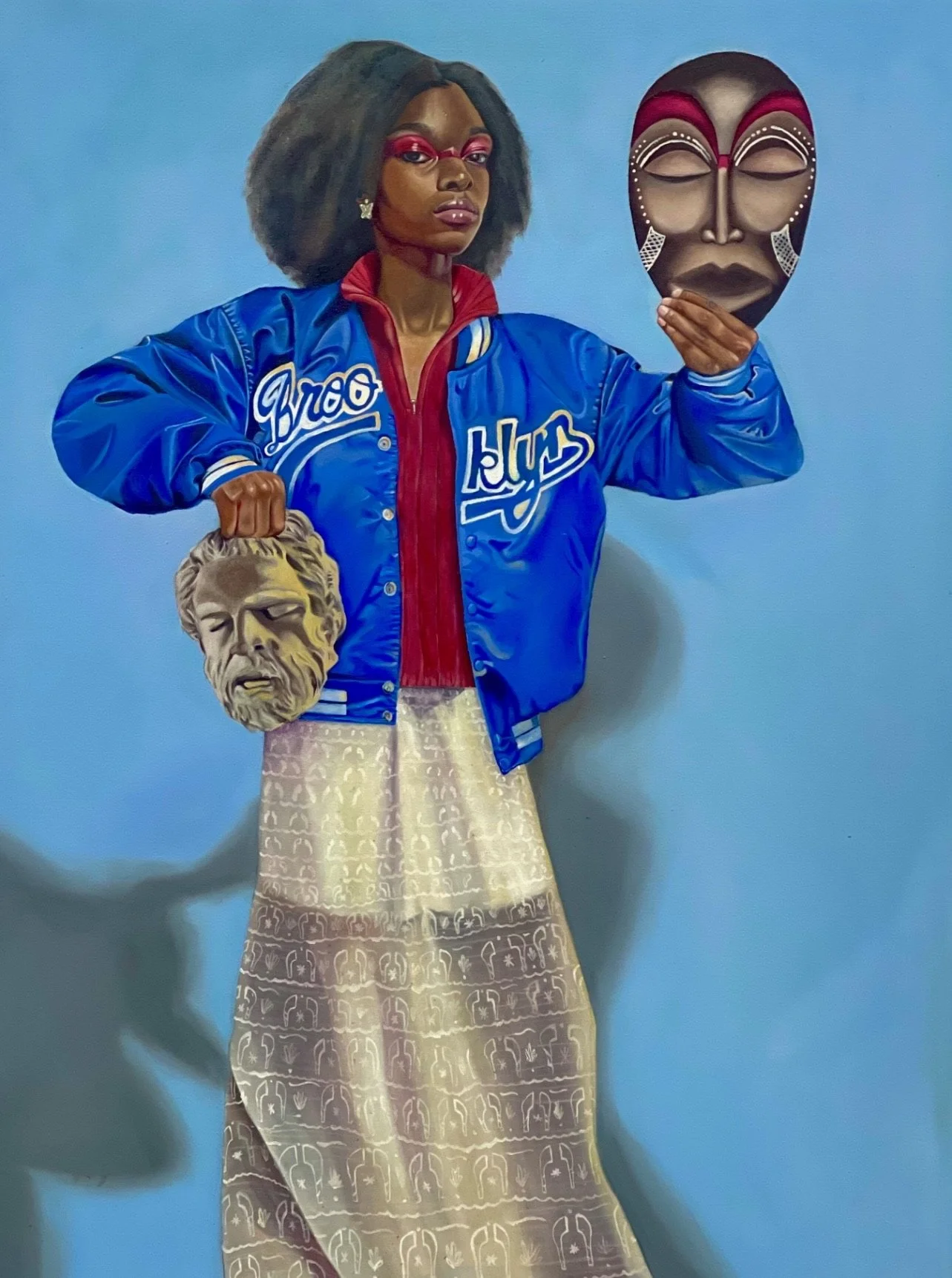 I create images; typically of Black bodies rendering friends, family, and other subjects from photographs each exploring elements of individuality and heritage. The emphasis on Black and Brown bodies is crucial, not only because of my heritage as a Nigerian-American but the opportunity to tell stories of the people who look like me, which are often erased or ignored in an art industry led by the continental ideologies of western art history. In representing Black and Brown bodies, I work to fashion a new idea of what it means to be Black or Brown in the type of stories I choose to imagine. Stories that often feel impossible for people who look like me to experience. Oftentimes, narratives of Black, Brown, and Indigenous people are rooted in trauma. My work gives way to seeing people of color beyond that language by introducing alternate realities where those traumatic languages may not exist. Although these alternate realities exist in total fantasy, they ultimately find a place that feels futuristic. It is unfamiliar but obtainable. With the addition of African symbols and urban styles, my work adopts an Afrofuturist aesthetic. This aesthetic is translated even further with the heavy use of textiles and patterns inspired by the West African patterning techniques.